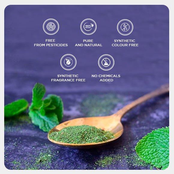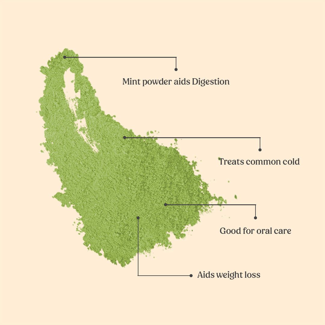 Mint powder aids digestion, treats common cold, cure head ache, good for oral care, aids weight loss, brightens complexion, treats acne and pimple, hydrates skin, slows aging, rejuvenates skin.